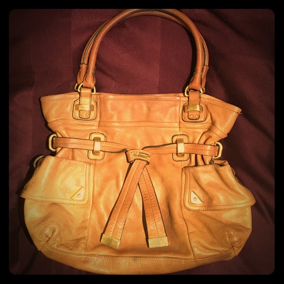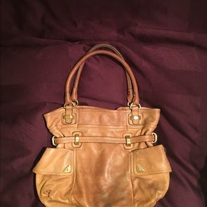 Soft and rich light brown leather. Designer is B. Makowsky. It is lined with Leslie's print. Had two outside pockets and multiple pockets on the inside for organization!