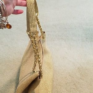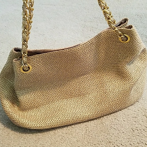Polyester faux straw purse with gold embellishments