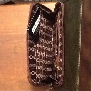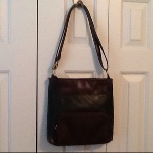 Tignanello leather dark green and brown purse. Has lots of storage with adjustable strap. Card holder in front has RFID identity protection so no one can scan your cards. Zippered pockets on back and inside. Pockets inside also. A place for everything. Measures 11x11.
