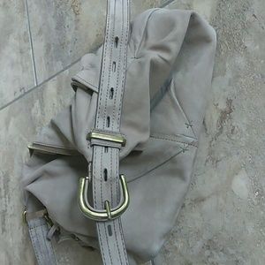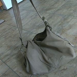 Cute Ann Taylor Loft taupe colored suede or leather purse.really soft material, 2 pockets on the outside w magnetic closures so they stay closed nice. Also a pocket on the outside side part. 1 zippered pocket inside as well as 1 pocket on the side of the inside. And 1 smaller pocket on inside as well as other space inside. Has flower pom pom that can be removed. Adjustable strap. It is a medium to large sized bag. Only used twice. Will be cleaned prior to shipment. Thanks for looking!