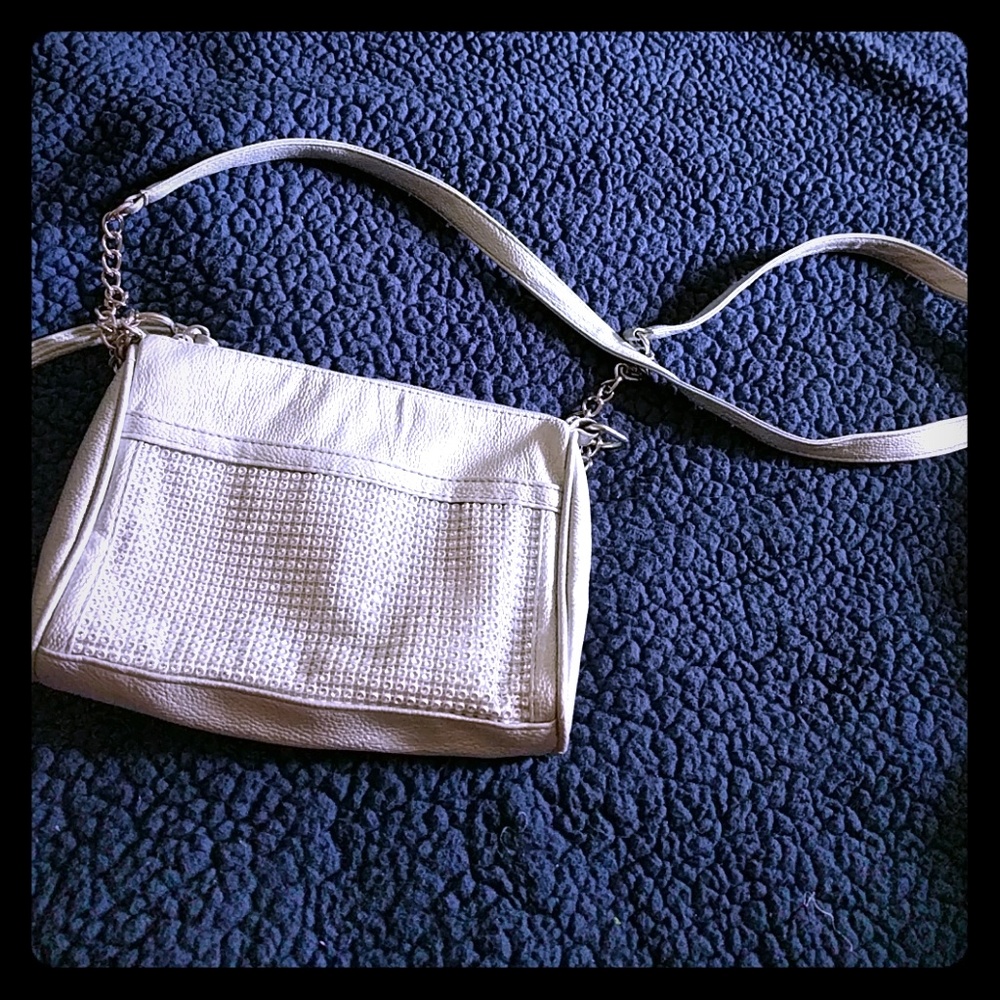 Silver purse with silver rhinestones, purchased from Express. Some wear inside purse, stains from ink pen (small)