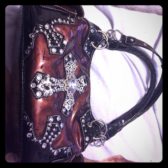 Brown purse with cross. It has a few marks on it and some wear and tear. Smoke free home