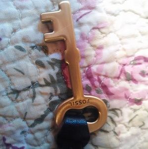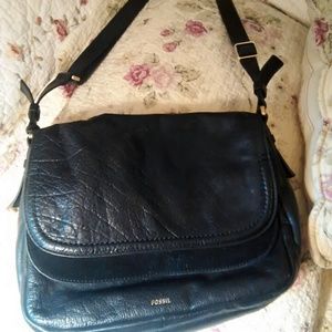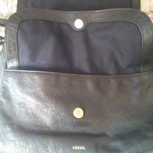 Genuine Fossil , black with gold leather bag. Lots of room and easy to organize with Interior zip pocket and another large space with zipper on the back plus snap pocket on the front. Complete with all hardware including the Fossil key. The straps are adjustable . Very gently used .