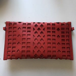 This is a red purse with gold accents. Can be used as a clutch or over the shoulder with gold chain.