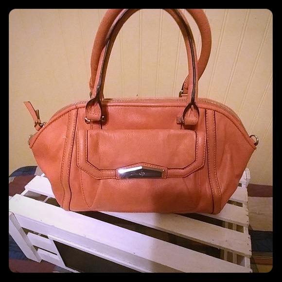 Dark peach almost orange purse. It has a pocket on the outside and 3 on the inside. Excellent condition.
