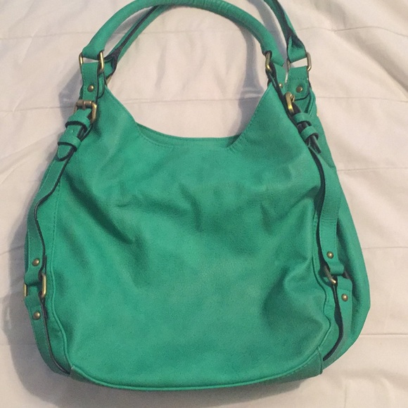 Green leather purse- 4 main compartments. Gold buckles