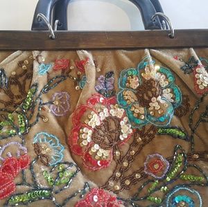 One of a kind floral sequins camel color velvet bag with hand carved wood handle 21" W. X13" ht. X7" deep. Interior compartments