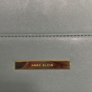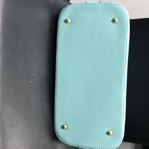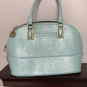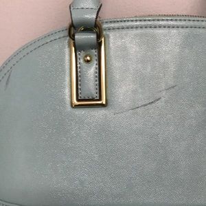 Teal Anne Klein purse. It does have 3 black marks on them that I tried using a magic eraser & it didn’t come off. Bottom, back, inside & side are great.
