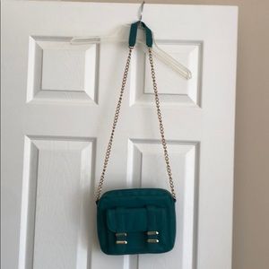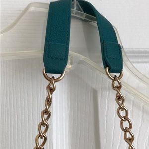 Greenish turquoise full leather purse with gold chain strap has couple compartments for your phone and accessories inside and has a zipper