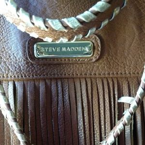 Leather fringe bag, over the shoulder, or cross body. Gold trim woven in shoulder strap