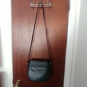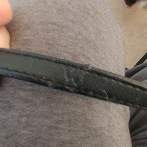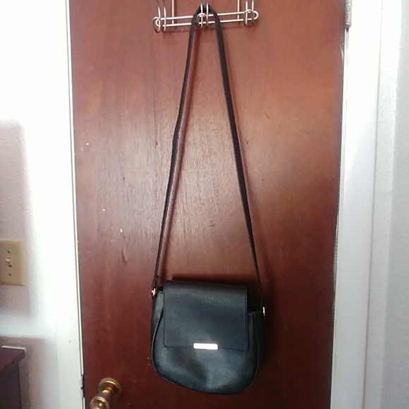 Black faux leather with gold accent. Closes with metal clasp. No pockets. Long strap, not adjustable. Chew marks on strap (in pictures). Dimensions roughly 8"Height X 9"Width. Comes from a smoke free pet friendly space