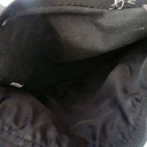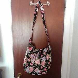 Black purse with pink flower deatils. No inside pockets, 3 putside pockets. Closes with a zipper, missing zipper pull but still works (see pictures) Adjustable strap. Dimensions roughly 13"Width X 12"Height. Comes from a smoke free pet friendly home.