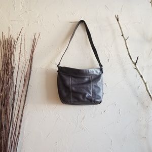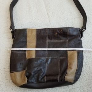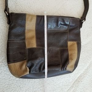 100% leather with manmade trim purse. Has two zippered pockets and one in the middle