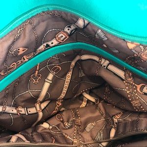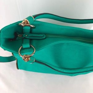 Cute turquoise purse. Has multiple dividers and zipper areas. Has two handles and a shoulder strap.