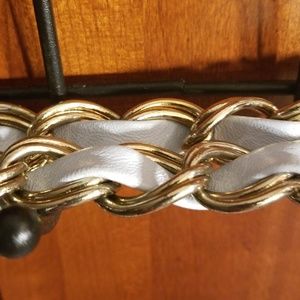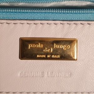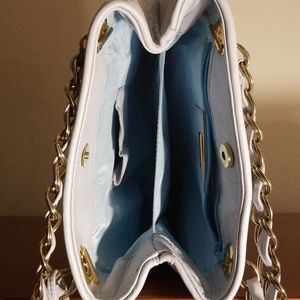 Quilted leather with gold hardware. 2 compartments with a snap closure. Light blue, expect compliments.