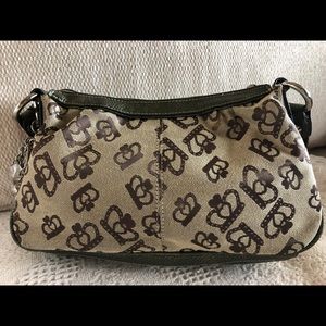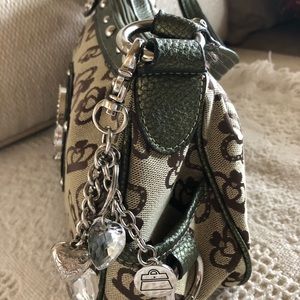 Purse has silver accent . On each side there is a pocket , that fits sunglasses phone or keys .Inside has multi pockets