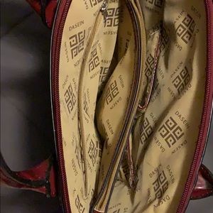 Burgundy purse with a lot of room. Very sturdy and fashionable.