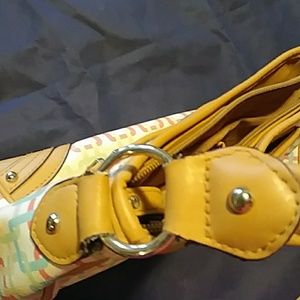 Rosetti brown and cream with a unique pattern of tan red blue and green. 1 outside back pocket. Multi-pocket interior. Made of 100% polyvivnylchloride. Easy to maintain. Nice hardware holding the braided handle in place. Smoker