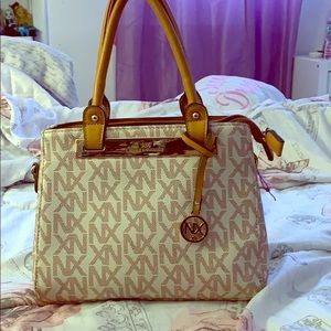 This beautiful light brown and white purse combines well with everything! It is small but comes in handy at any time and its very light to carry around!