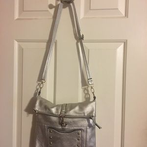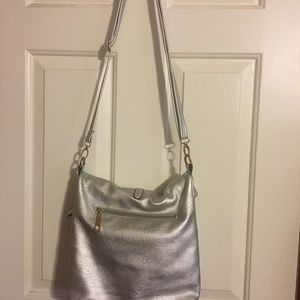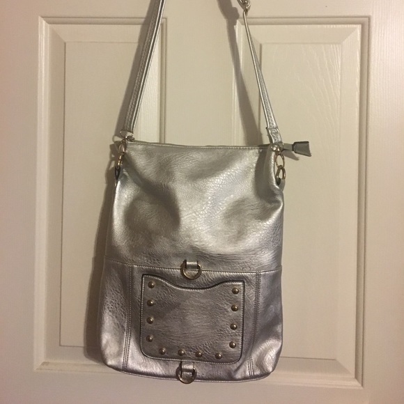 Silver faux leather. Shoulder or cross body purse. Great size. Zippered. Like new