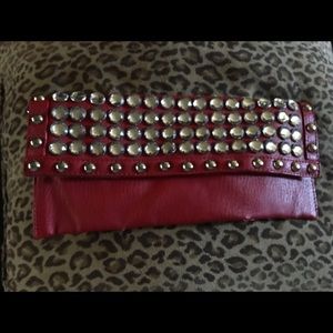 Red leather small purse. Studs with crystals on the front. 16 inch chain handle, zipper compartment in the back, and on the inside! 9 1/2 by 4 inches