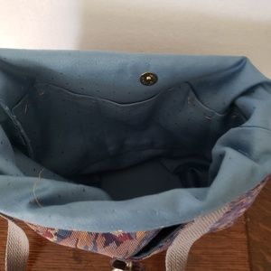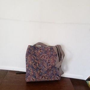 A purse made of brocade fabric. Has two large front pockets good for your cell phone or keys. Inside has pockets on one side. Has shoulder straps and a button to embellish.
