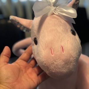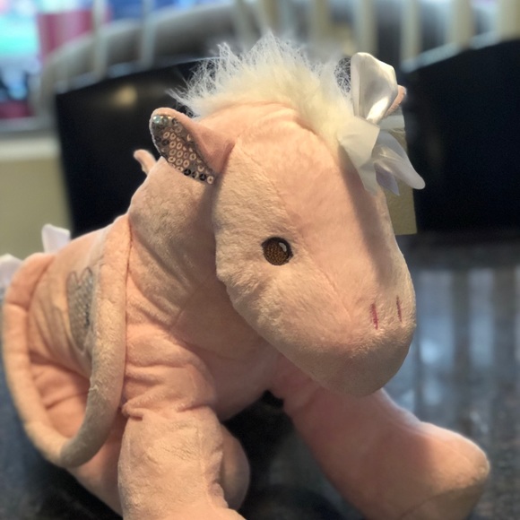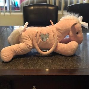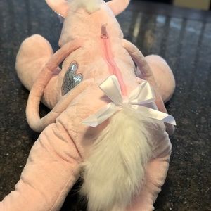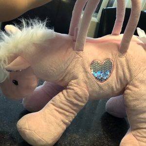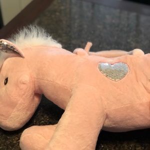 Pink horse plush ruse. Pink and white horse details in silver sequins.