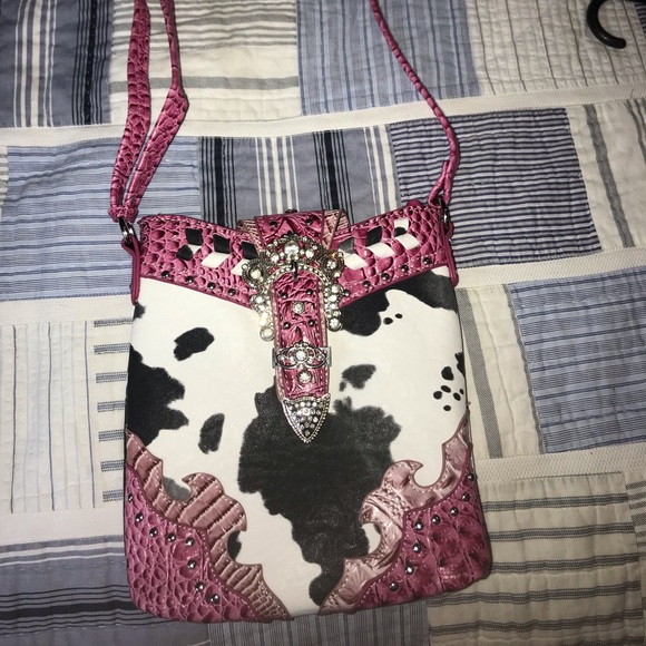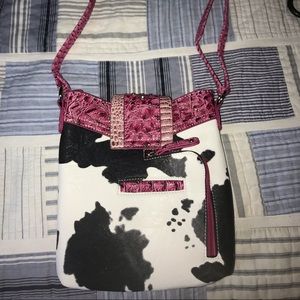 NEVER BEEN USED!!! This purse is absolutely darling. It is faux leather/cowhide. It has a concealed weapons pouch on the back too if needed 😊
