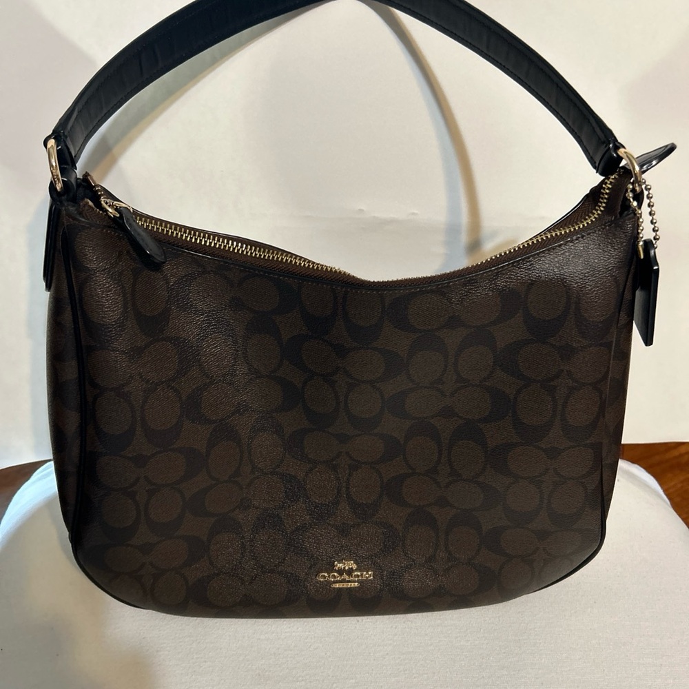 It’s a Coach shoulders bag, with no zipper pockets on the outside but it has pockets on the inside of the bag.