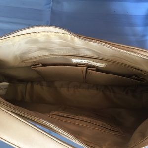 A tan purse from Worthington. To cellphone pockets, a zip pocket, and 3 card slots on the inside. Zipper pocket on the outside. Some scratches on the outside.