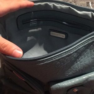 Blue. Full of pockets. Faux leather. Adjustable strap