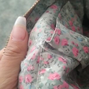 It has gold on the front and has dirty pink tassels and has some gold jewels. On the inside it has flowers and tiny pockets.
