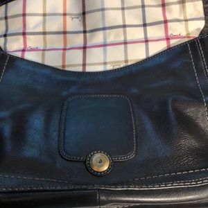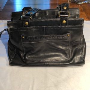 Black gloved tanned cowhide leather. 12x8.5. A bag of substance. Zipped inner pocket and phone pouch, etc. Outer flap pouch for added convenience. carried several times. Excellent condition.