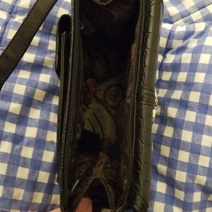 Triangle shaped black leather like purse. Never used , adjustable shoulder strap, built in wallet.