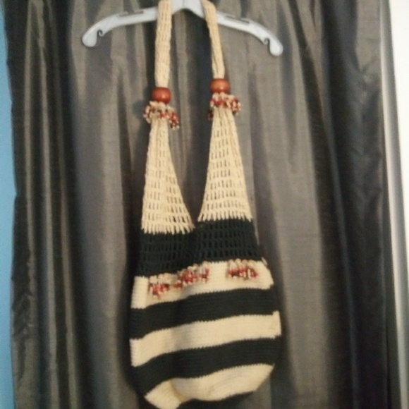 Hobo style knitted purse. Perfect for the summer. Navy blue and tan. Durable material. Inside pocket.