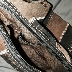 Vintage leather and suede Fossil purse with zipper and two deep outside pockets. Textured, smooth and suede leather in gold black and brown. Clean inside and outside. No damage of wear. Has a zippered inside pocket and two open ones inside for cell phone. Very good condition and intact hardware.
