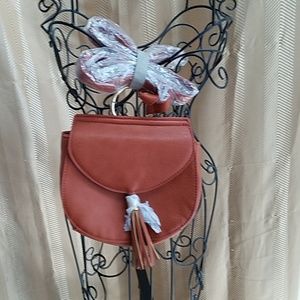 Cross body rust purse with tassel & gold ring connecting straps to purse. Sold at Nordstrom