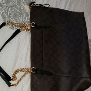 Coach brown/black leather monogram authentic coach purse with gold colored chain. Worn once..Beautiful medium to large shoulder bag w card in the zipper.