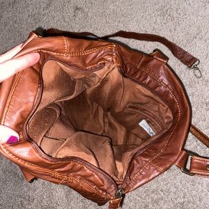 Brown, shoulder or crossbody. Removable strap. Zipper pockets on each side outside.