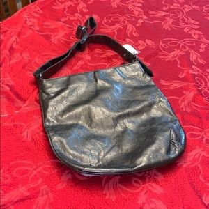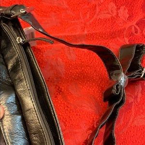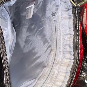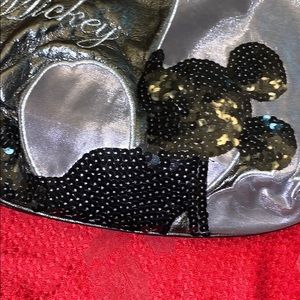 Disney Mickey faux leather purse. The name Mickey is monogrammed on the front. Has two sequined images of Mickey on the front. It has an adjustable strap. Inside is silver/gray. Has a side zippier on the inside. It is official Disneyland merchandise from the park.