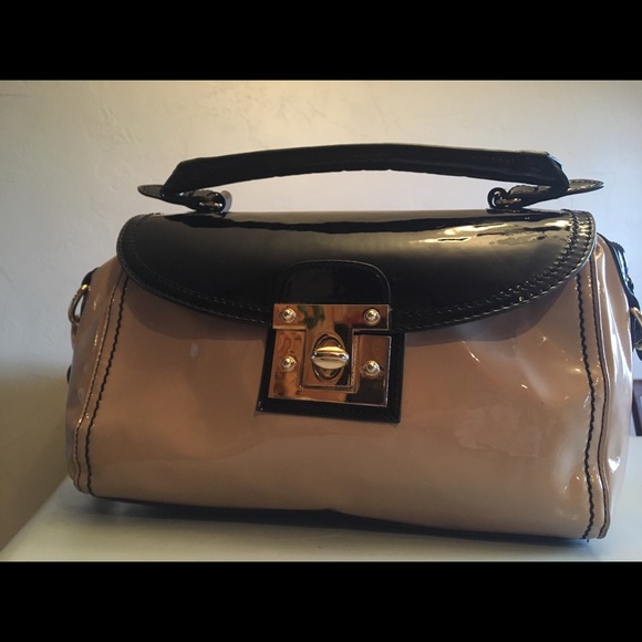 Apt. 9 bag. Hand-stitched bag with gold turn-clasp including two zipper compartments. Used- inside make-stains.