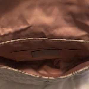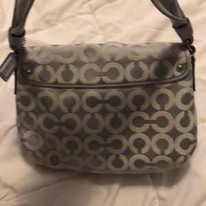 Grey small coach purse, super cute for a night on the town with pink lining. There is a small black dot on the handle, looks like a black marker dot. Other than that in great used condition