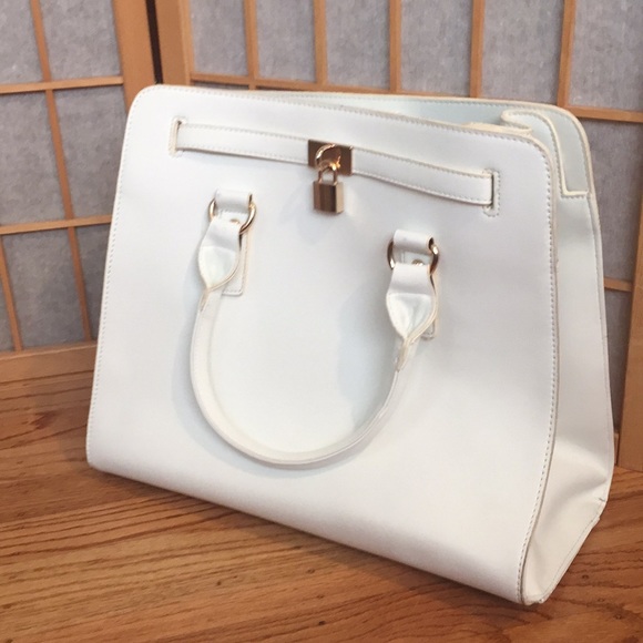 Two handle bag purse with two side pockets on one side in the purse and one zipper pocket on the other side of the purse.