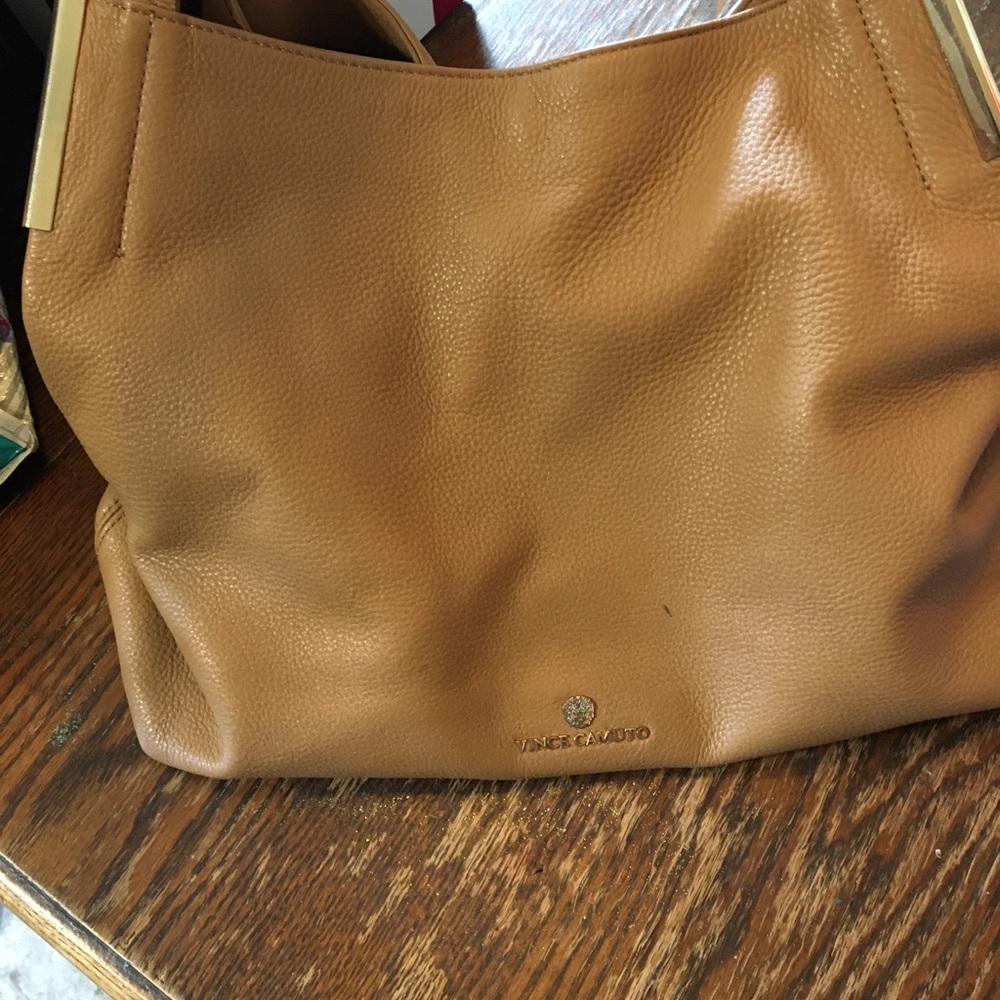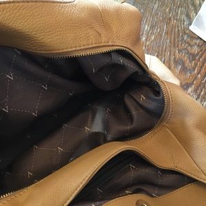 Tan leather shoulder bag with three sections. One has pockets, middle us open and other has double pockets