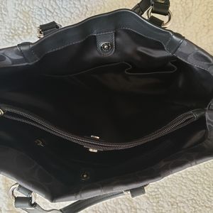 Coach purse with detachable shoulder strap. Metal circle hardware on both sides of bag. Roomy two section purse with a compartment in the middle that zips. Snaps closed. Almost new condition.