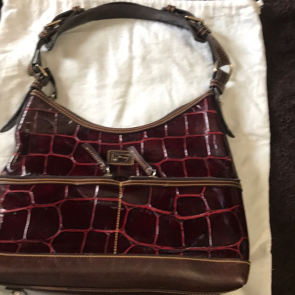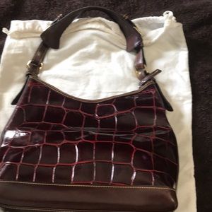 Red and brown embossed alligator leather purse. This is a gorgeous bag! Two exterior zip pocket, one interior zip pocket, and two interior open pockets.