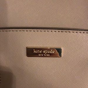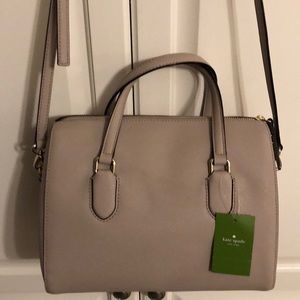 Kate Spade bag with saffiano leather. Color is very neutral, mix of mauve and light taupe/gray. Gold hardware. NWT. Top handle with removable crossbody or shoulder strap.
