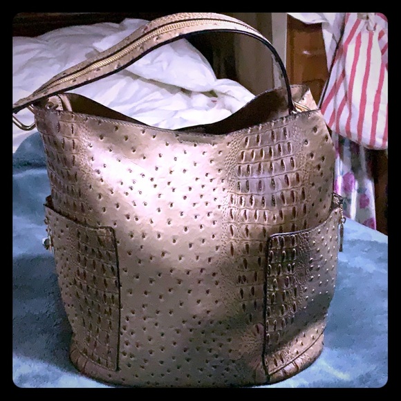 Faux leather bucket bag. 2 useable pockets on sides, snap key carrier on inside & single snap closure