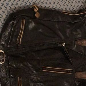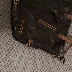 Gorgeous dark leather bag by Free People. Outside is 100% leather, inside is 100% cotton. One zipper compartment in the inside, three small zipper compartments on the outside. Beautiful detailing. 17” high and 17” wide, 2 handles and a shoulder strap.