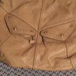 Like new condition, tan shoulder purse by Hobo. Two pockets on the front, one pocket on the backside, two pockets on the inside, zipper across the top. Leather outer, cotton fabric inside. 15” long, 17” wide.